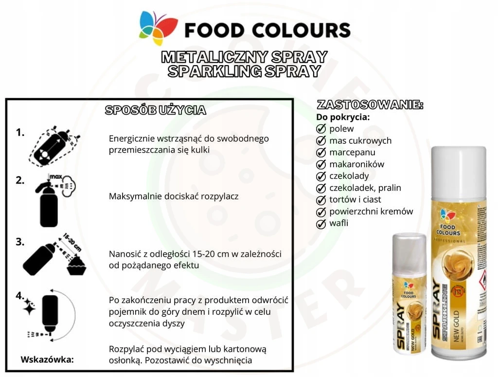 W odróżnieniu od innych metalicznych barwników w sprayu jest jadalny i nieszkodliwy dla zdrowia. Nie zawiera związków azowych i barwnika dwutlenku tytanu E171.